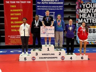 Over the weekend, Cy Wilmes and Killian Evans competed in the Missouri State Wrestling Tournament. Cy Wilmes (190lb) placed 5th overall in Boys Class 4 and Killian Evans (110lb) placed 2nd overall in Girls Class 2.